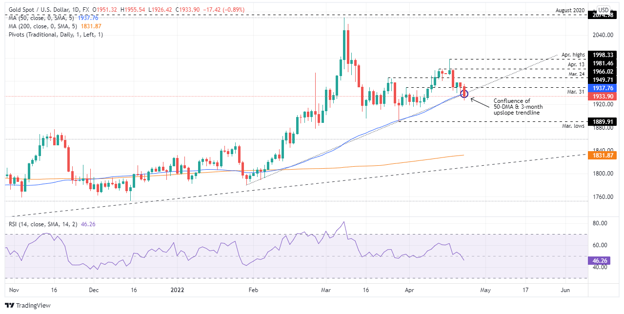 The Gold Price remains downward pressured in the mid-New York session, threatening to break a two-month-old upslope support trendline, which passes on top of the 50-day moving average (DMA) near the $1930-40 area. Factors like continuing hawkishness expressions by Fed officials and higher US Treasury yields weighed on the precious metal price, as XAUUSD is falling some 0.90%, trading at $1933.90 a troy ounce at the time of writing.