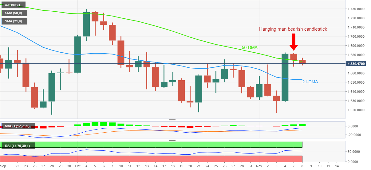Gold price justifies the previous day’s “hanging man” bearish candlestick as it extends the pullback from a one-week high below the 50-DMA.