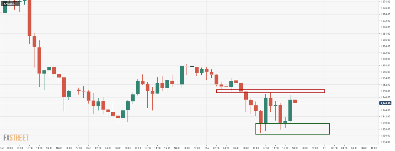 As the day goes by, the Gold Price (XAUUSD) is holding in a key support territory just shy of the 50-day moving average (DMA), around $1936.12. This is an area with the confluence of the trendline drawn from February 2022 lows. Bulls are stepping in at this point as per the hourly chart: