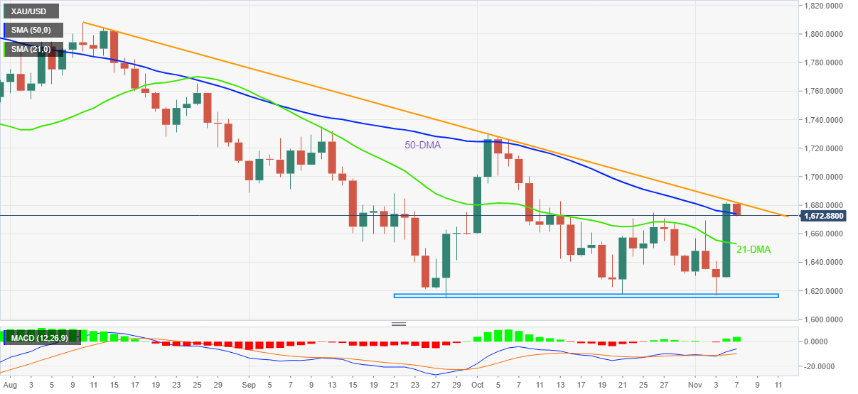 Gold price pulls back from a three-month-old descending resistance line as sellers attach the 50-DMA support near $1,675, a break of which could quickly direct the bears towards the 21-DMA level of $1,653.