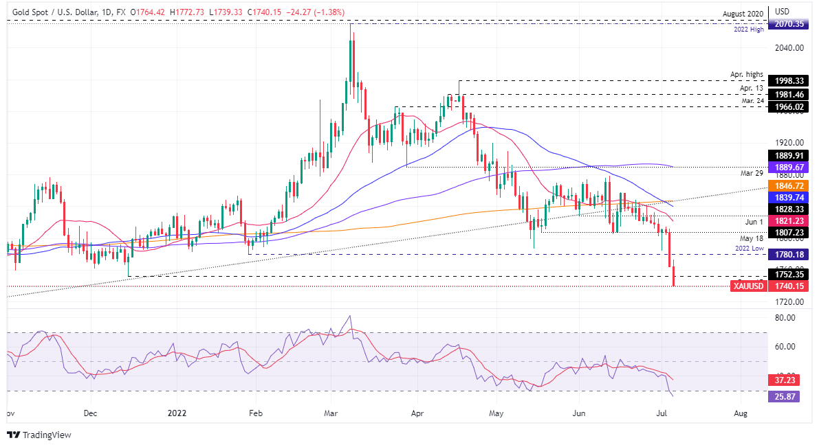 Gold price tumbles to fresh multi-month lows below $1752.51, amidst concerns of a global economic recession, but also driven down by a solid greenback, which remains to record new two-year highs as shown by the US Dollar Index, underpinned by rising US Treasury yields. At the time of writing, XAUUSD is trading at $1740.15 a troy ounce.