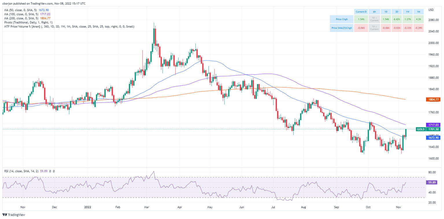 Gold price is subdued as the North American session begins, extending its gains due to a bid US Dollar as midterm elections in the United States increased risk appetite while rising US Treasury yields are a headwind for the precious metals segment. Hence, the XAUUSD is trading at $1,694.60, slightly above the 50-day Exponential Moving Average (EMA), down by 0.04%.