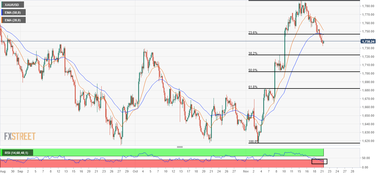 On a four-hour scale, the gold price has dropped below the 23.6% Fibonacci retracement (placed from November 3 low at $1,616.39 to November 15 high at $1,786.55) at $1,746.67. The asset has dropped below the 20-and 50-period Exponential Moving Averages (EMAs) at $1,751.40 and $1,746.67 respectively, which adds to the downside filters.