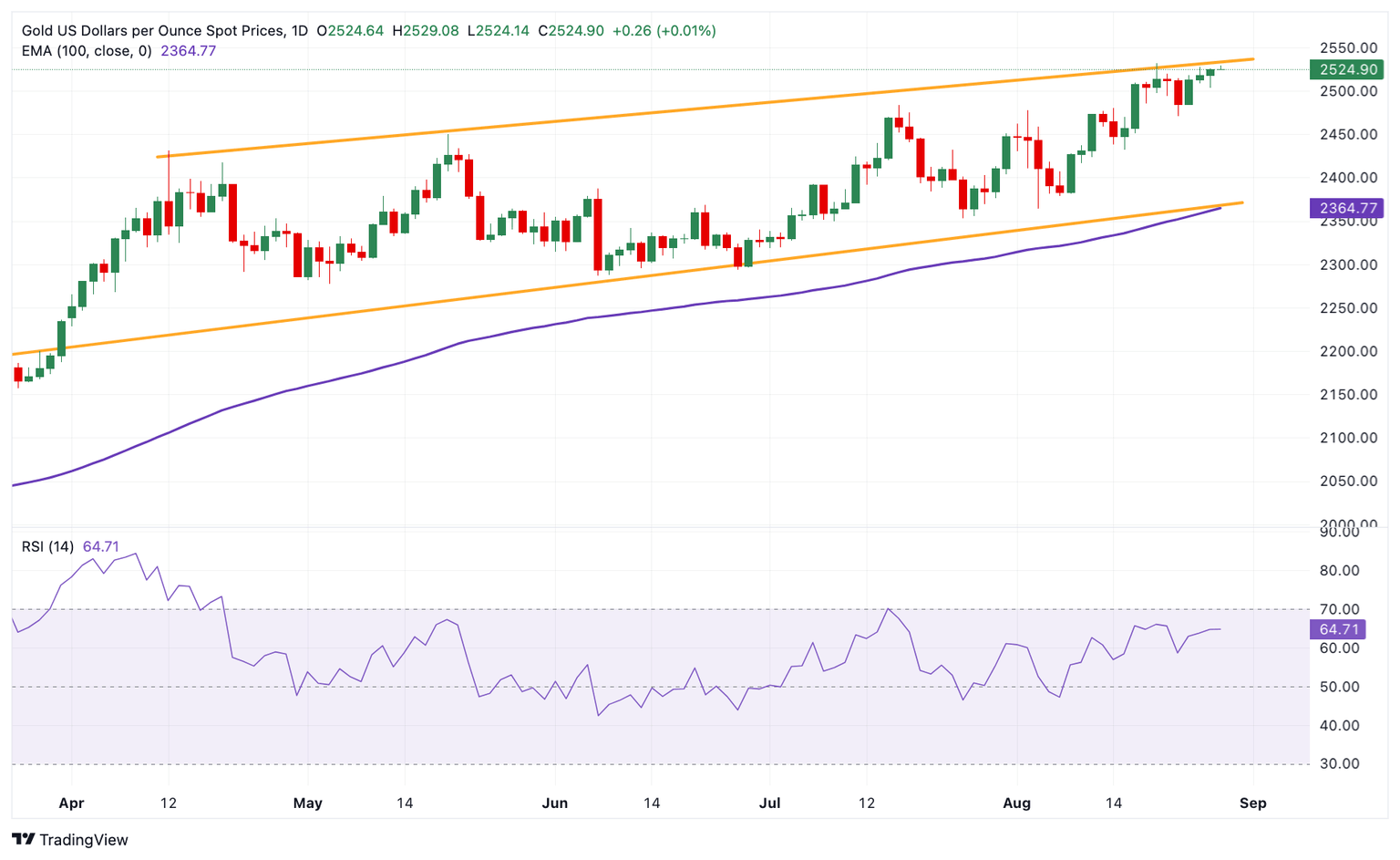 The Gold price (XAU/USD) loses momentum amid the modest rebound of the US Dollar (USD) on Wednesday. However, the escalating geopolitical tensions in the Middle East might help limit its losses. Additionally, US Federal Reserve (Fed) Chair Jerome Powell's speech at the Jackson Hole symposium last week, signalling “time has come” to begin lowering interest rates, might support the precious metal as it reduces the opportunity cost of holding non-interest-paying assets.
