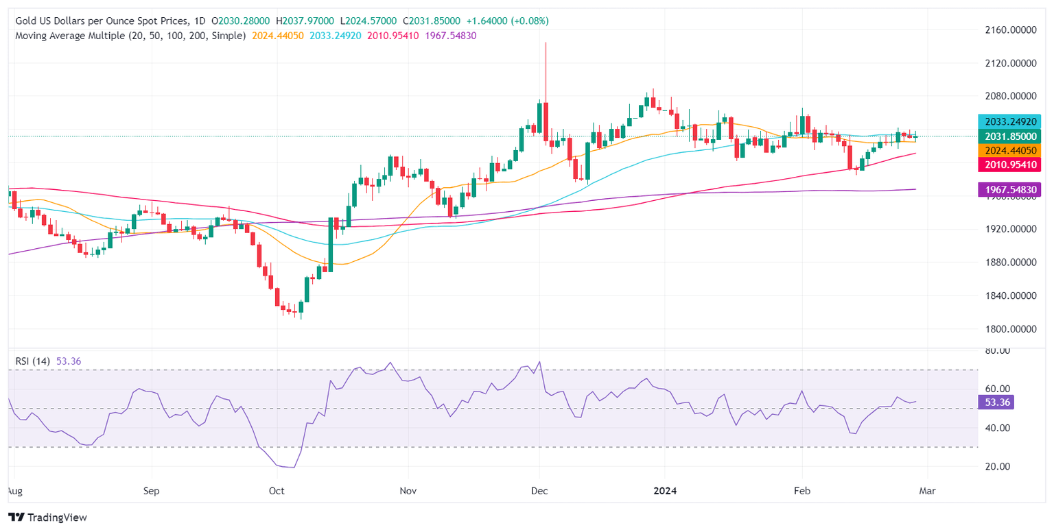 On the flipside, if Gold falls below the February 16 swing low of $2,016.15, XAU/USD would dive toward the October 27 daily high-turned-support at $2,009.42. Once cleared, that will expose key technical support levels like the 100-day SMA at $2,009.42, followed by the 200-day SMA at $1,967.45.