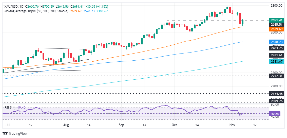 Gold rebounded at around the 50-day Simple Moving Average (SMA) at $2,639 and aimed towards the $2,700, but buyers lacked the strength of push prices higher. The first key resistance area for bulls would be $2,700; if cleared, the next stop would be the 20-day SMA at $2,716, ahead of $2,750.