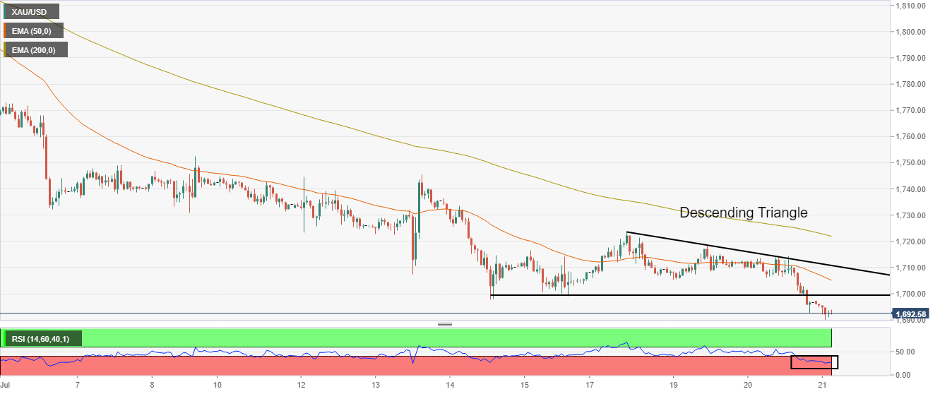 Gold price has given a downside break of the Descending Triangle that signals a volatility contraction with a downside bias. The downward-sloping trendline of the above-mentioned chart pattern is plotted from July 18 high at $1,723.97 while the horizontal support is placed from June 14 low at $1,697.69.