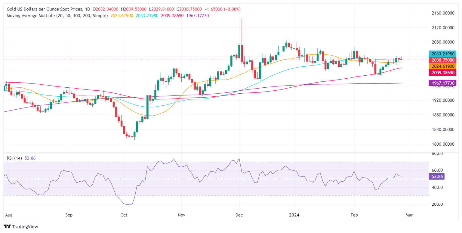 On the flipside, if Gold falls below the February 16 swing low of $2,016.15, XAU/USD would dive toward the October 27 daily high-turned-support at $2,009.42. Once cleared, that will expose key technical support levels like the 100-day SMA at $2,009.56, followed by the 200-day SMA at $1,967.09.
