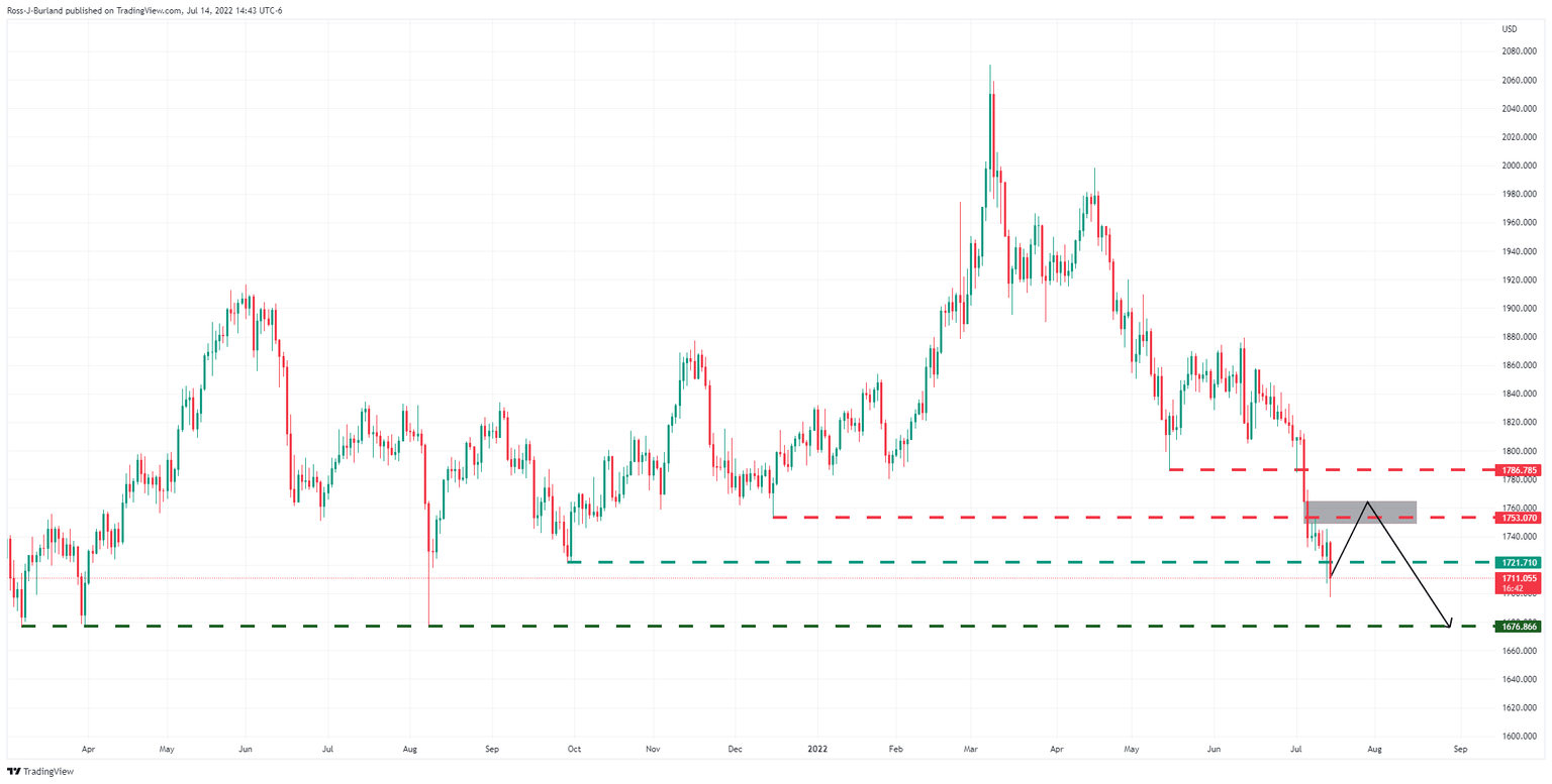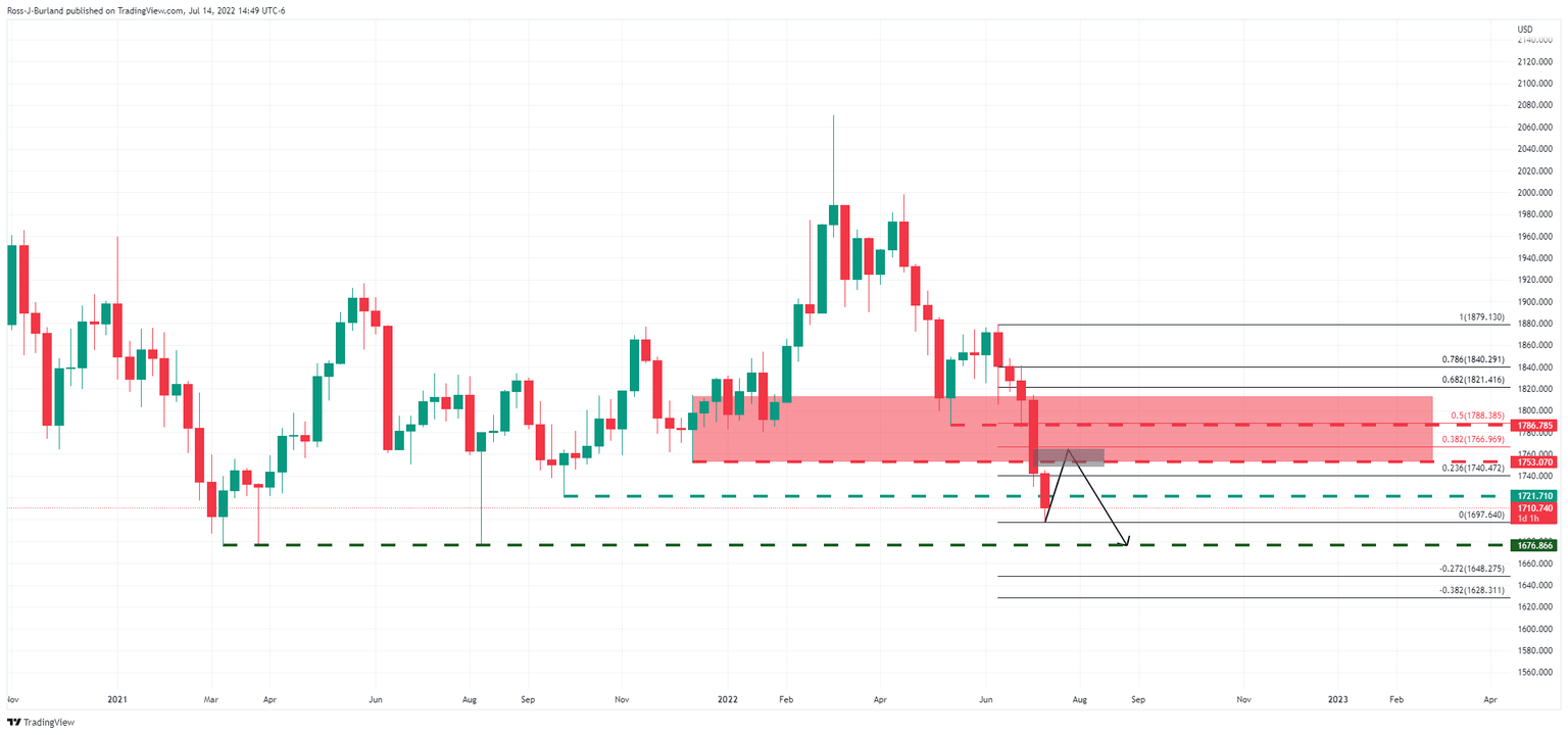 - The Gold Price is offered below critical market structure and the focus in the main is on the downside towards monthly lows of $1,676.86.
