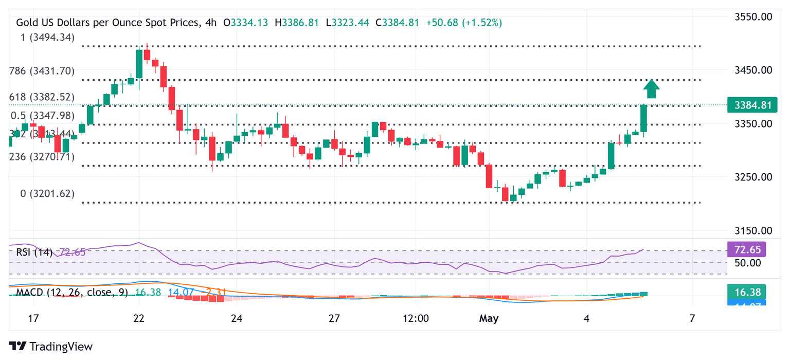 From a technical perspective, the strong intraday move higher lifts the Gold price beyond the $3,350 hurdle, which coincided with the 50% Fibonacci retracement level of the recent pullback from the all-time peak. This, along with positive oscillators on the daily chart, suggests that the path of least resistance for the commodity remains to the upside. Some follow-through buying beyond the 61.8% Fibo. level, around the $3,385 region, will reaffirm the positive bias and lift the XAU/USD beyond the $3,400 mark, towards the next relevant barrier near the $3,425 zone. The subsequent move up should allow bulls to make a fresh attempt to conquer the $3,500 psychological mark.