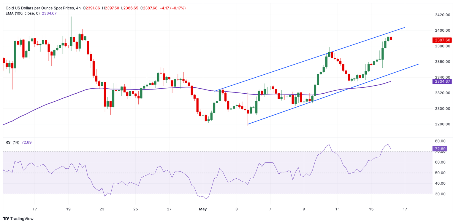 The gold price trades on a positive note on the day. According to the four-hour chart, the precious metal has formed an ascending trend channel since May 2. The constructive outlook of gold remains intact, as it is above the 100-period Exponential Moving Average (EMA). The path of the least resistance is to the upside, as the Relative Strength Index (RSI) stands in the bullish territory around 72.00.