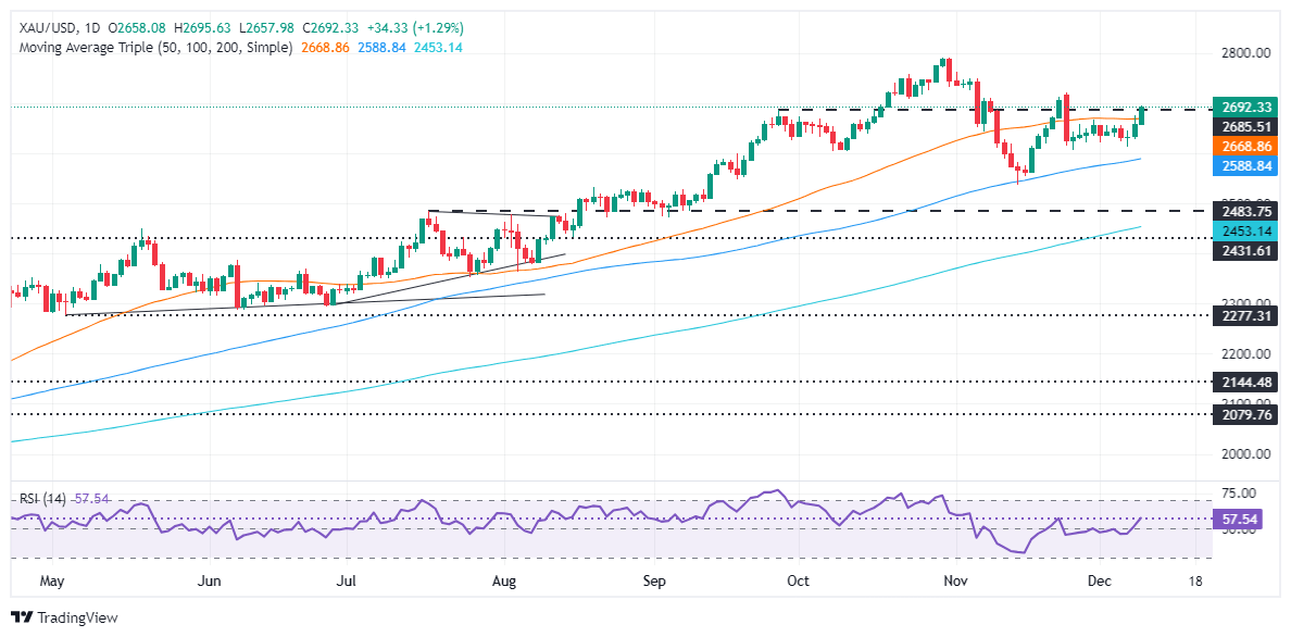 Gold’s uptrend resumed on Tuesday, extending its gains past the 50-day Simple Moving Average (SMA) at $2,685, as well as opening the door to challenge the $2,700 figure. The Relative Strength Index (RSI) remains bullish, hinting that buyers are gaining control.