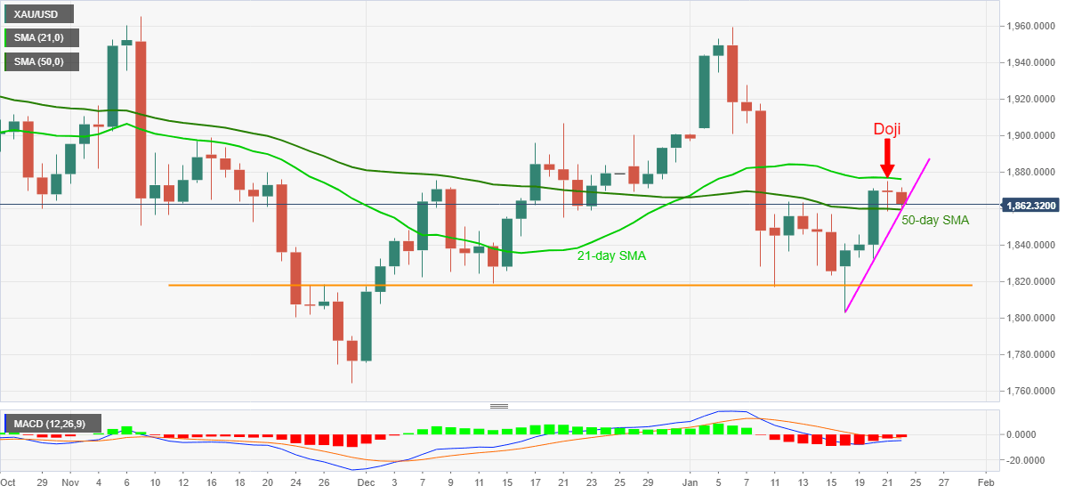 Gold bounces off intraday low of $1,859.00 to $1,862.10, down 0.37% on a day, during early Friday. The yellow metal refreshed two-week high the previous day but failed to cross a 21-day SMA. The resulted moves portrayed a Doji candlestick on the daily (D1) chart, which in turn gained support from the bearish MACD signals to portray today’s downtick.