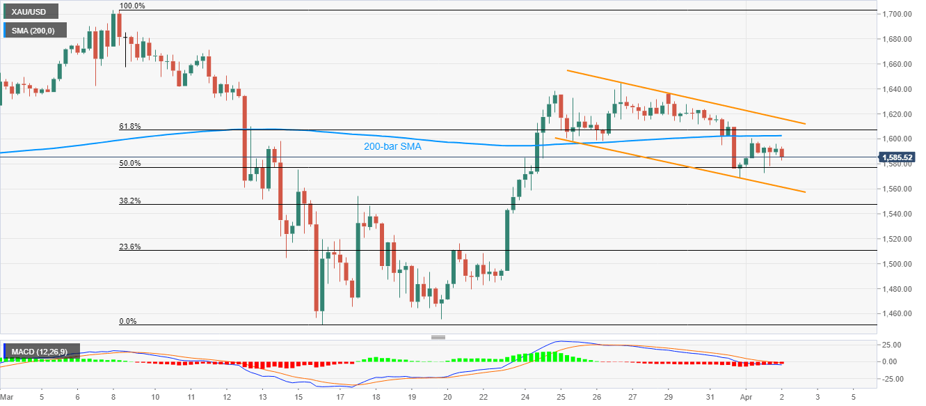 While defying Wednesday’s recovery moves, Gold prices drop to $1,585, down 0.40%, amid the early Thursday’s trading session. In doing so, the yellow metal remains inside a one-week-old descending trend channel while also staying below 200-bar SMA and 61.8% Fibonacci retracement of its March 09-16 declines.