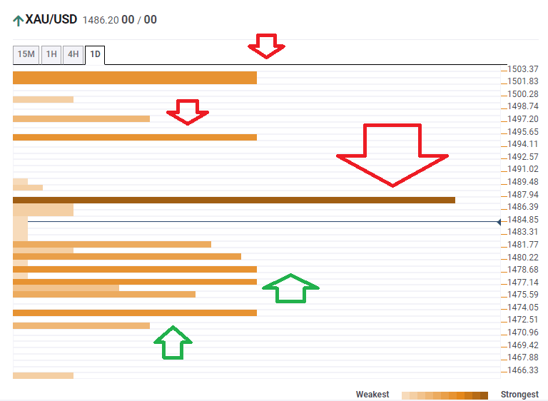 Gold has been on the back foot in a turbulent week as investors were in a "sell everything" mode. How is XAU/USD positioned as the week draws to an end? The Technical Confluences Indicator is showing that gold is capped at $1,487, which is the convergence of the Simple Moving Average 50-1h, the previous 4h-high, and the Fibonacci 61.8% one-day.