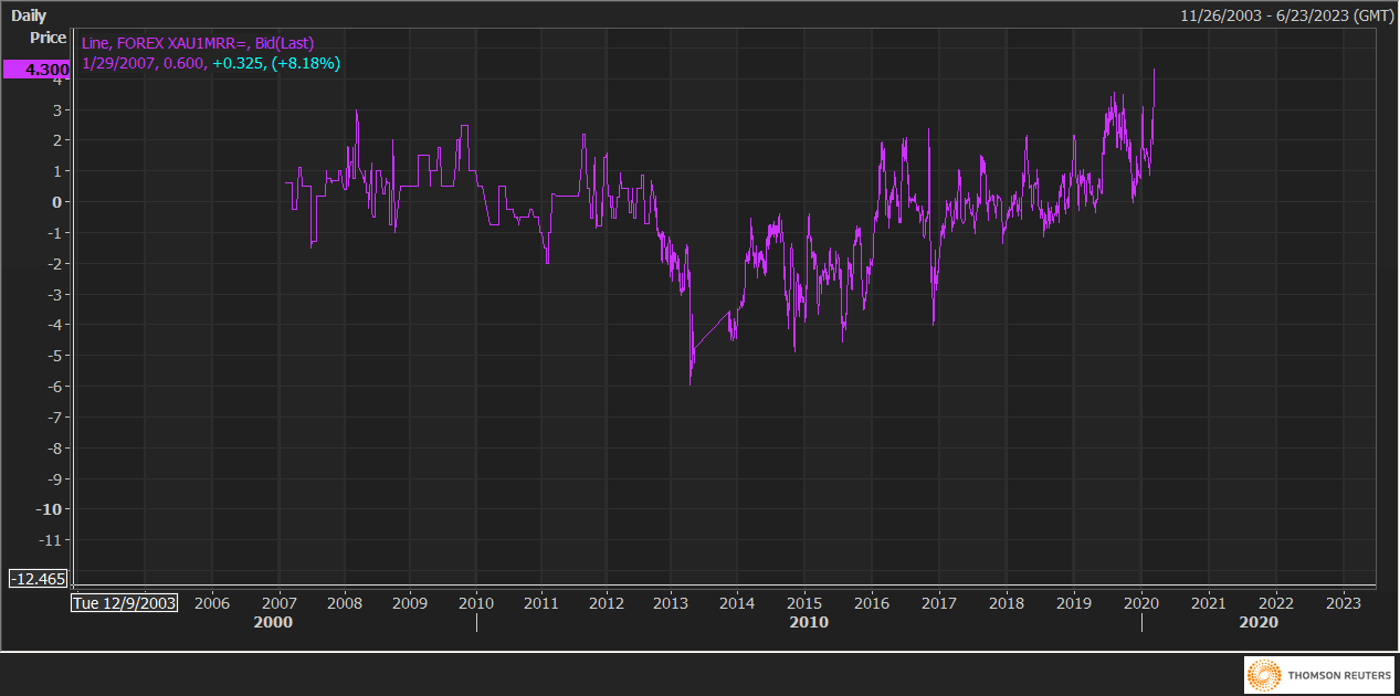 A positive number indicates the implied volatility premium or demand for calls is higher than that for puts. Gold's spot price is currently trading at $1,698 per Oz, representing a 1.5% gain on the day. The yellow metal is up over 10% on a year-to-date basis.