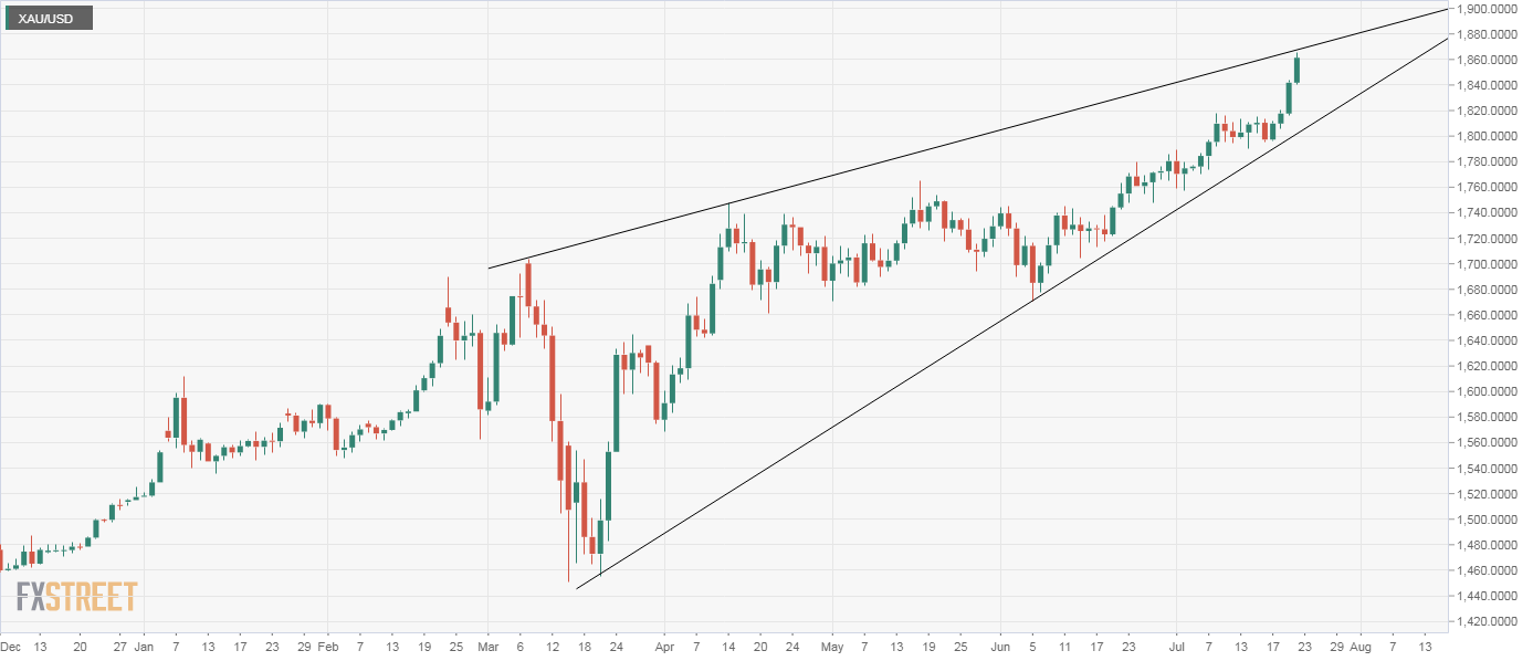 Gold (XAU/USD) bulls remained unstoppable, as the yellow metal rallied nearly $15 in a matter of 15 minutes. The spot refreshed the highest levels in nine years at $1866.90. The persistent weakness seen in the US dollar across the board continued to bode well for gold, as markets cheered additional US stimulus talks and EU fiscal deal.