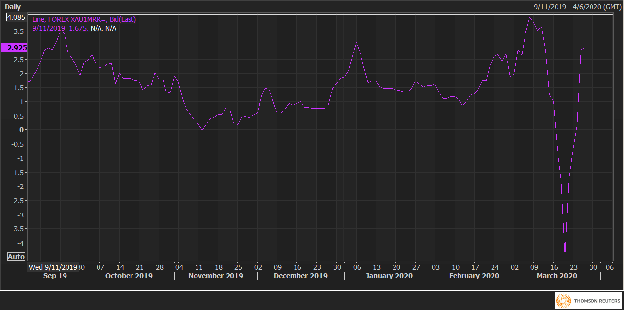 One-month risk reversals (XAU1MRR), the cost of swapping equally out-of-the-money puts and calls, flipped in favor of calls on Tuesday, as the metal rose more than 4 percent, extending Monday's 3.7% price gain.