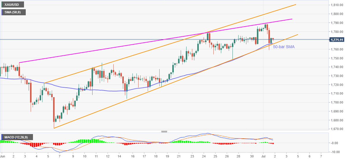Gold prices stay soft around $1,772 during the early Thursday morning in Asia. The bullion refreshed the multi-year high the previous day. Though, a one-month-old rising trend line tamed the bulls. The precious metal currently takes round to the support line of a short-term bullish channel, also nearing the 50-bar SMA amid bearish MACD signals.