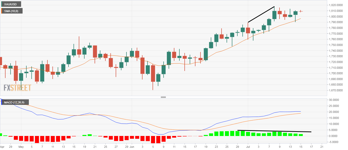 Gold is sidelined around $1,809 per ounce at press time with the daily chart MACD histogram, an indicator used to identify trend changes and trend strength, reporting a bearish divergence.