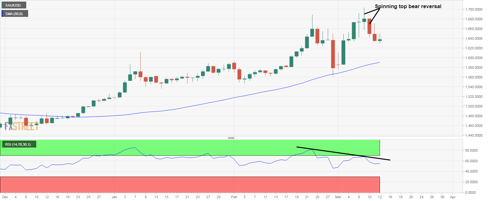 Gold is currently trading at $1,637 per Oz, having hit a high of $1,650 in Asia. The pullback is not surprising, as the technical studies are biased bearish. To start with, the daily chart shows a spinning top bearish reversal pattern - Monday's spinning top followed by a 1.8% drop on Tuesday.