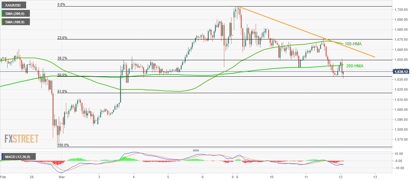 Despite an increase in the market’s risk-off moves following US President Donald Trump’s fiscal stimulus, Gold prices trimmed some gains to $1,638.50 during early Thursday. In doing so, the yellow metal takes rounds to 200-Hour Simple Moving Average (HMA), at $1,644.60 now, while staying below the $1,665/66 resistance confluence including 100-HMA and weekly falling trend line.