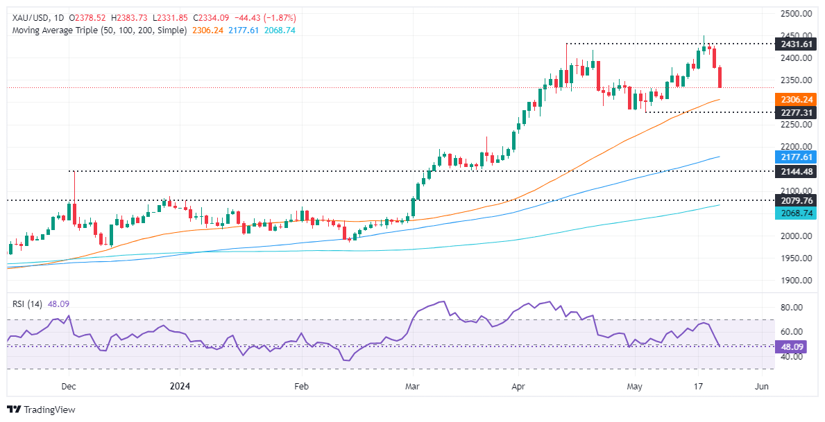 That said, the XAU/USD’s first support would be the May 13 low at $2,332, followed by the May 8 low of $2,303. Once those levels are surpassed, the 50-day Simple Moving Average (SMA) at $2,307 will be up next.