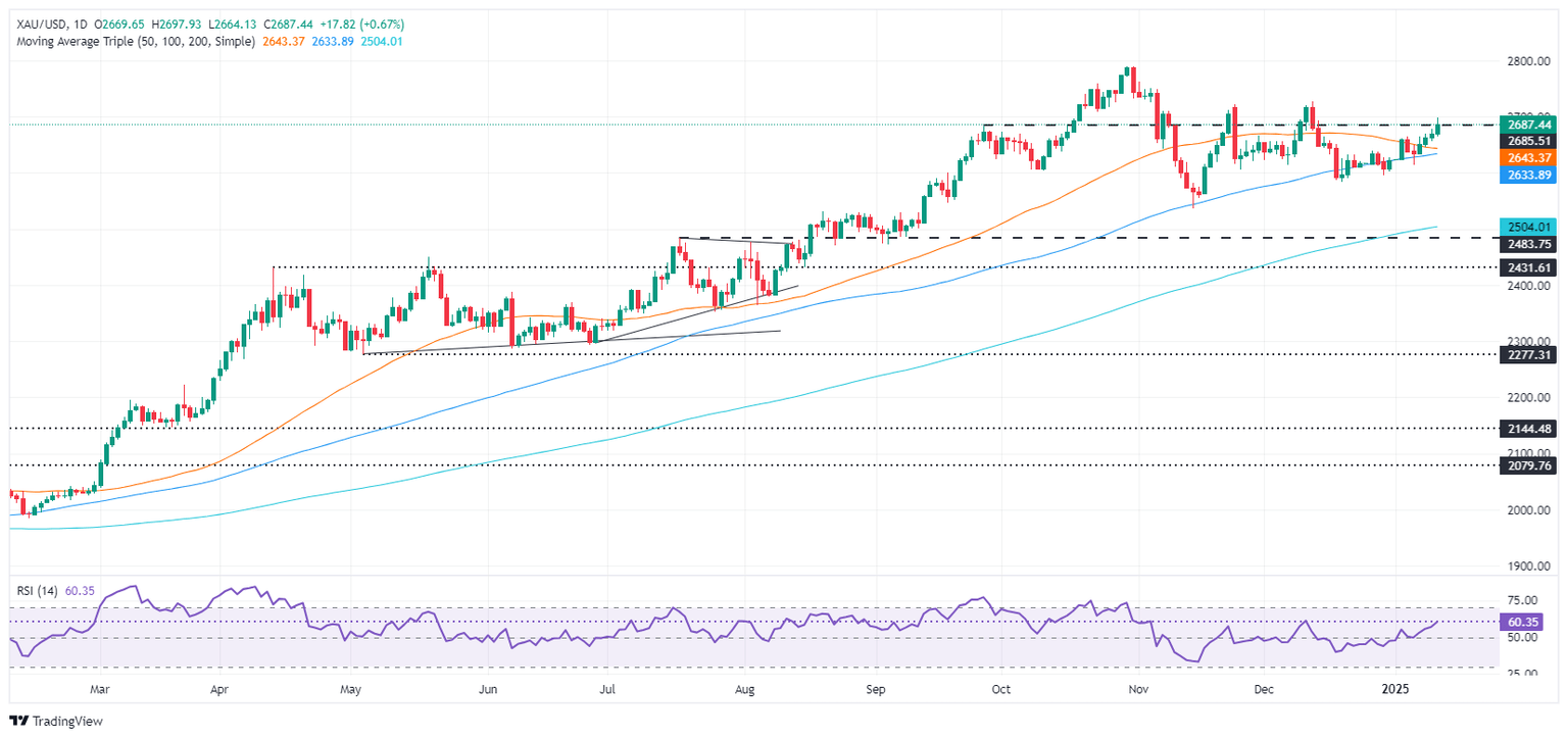 If XAU/USD clears $2,700, the next resistance would be the December 12 high of $2,726 and the all-time high (ATH) at $2,790.