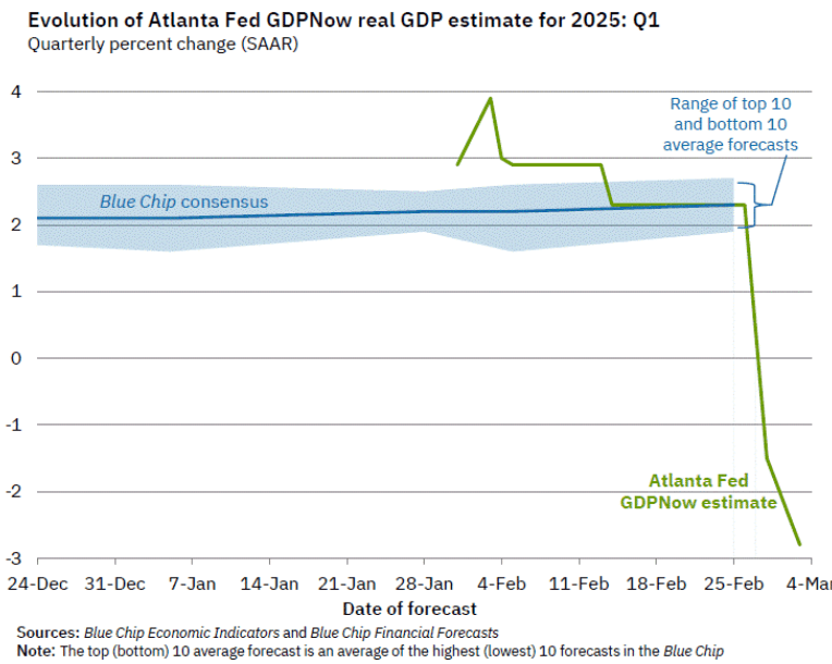 In the meantime, the last round of US economic data pushed the Atlanta GDP Now Q1 2025 forecast model further deep into negative territory from -1.6% on February 28 to -2.8% as of writing.