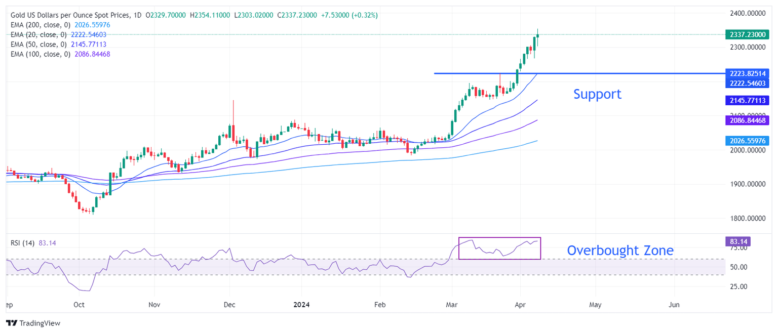 Gold price continues to add gains even though momentum oscillators turn extremely overbought – a situation when upside potential gets limited. The precious metal rallies to $2,350 but is expected to turn sideways as investors are expected to make fresh positions after the release of the US inflation data.