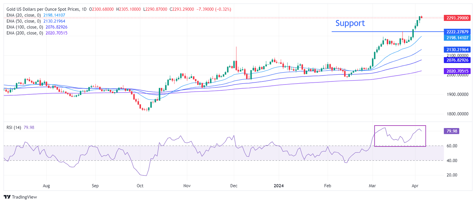 Gold price is consistently refreshing its lifetime highs supported by multiple tailwinds. The precious metal tests the round-level figure of $2,300. However, it struggles to continue its winning streak for the seventh trading session on Thursday.