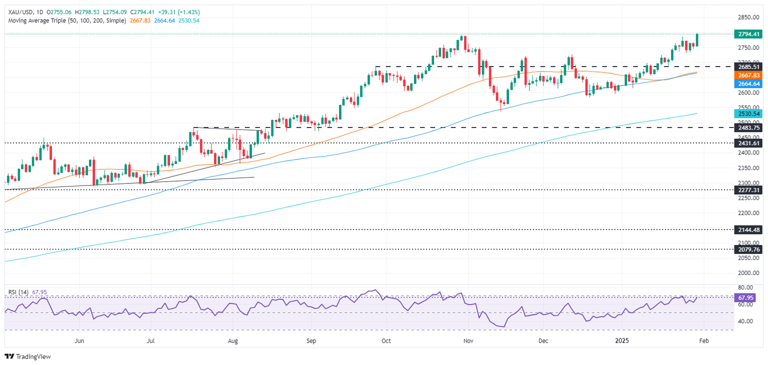 Gold price skyrockets to a new all-time high (ATH) of $2,798 on Thursday after economic data from the United States (US) indicated the economy is slowing down, warranting the Federal Reserve (Fed) to lower interest rates despite holding them steady at Wednesday’s meeting. At the time of writing, the XAU/USD trades at $2,794, up 1.31%.