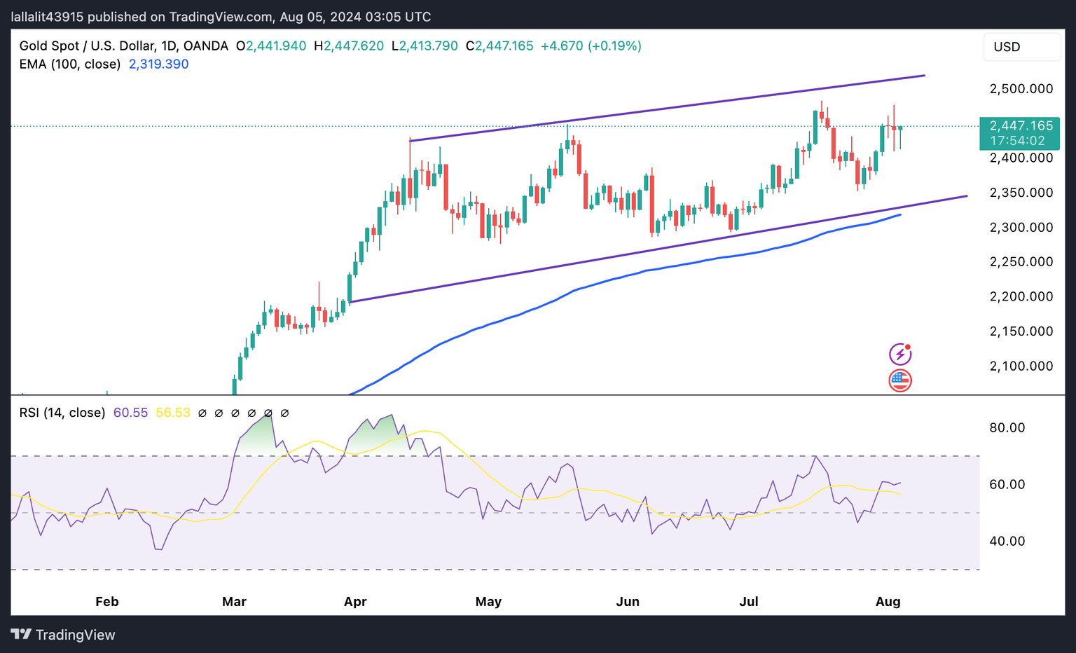 The precious metal has traded within the ascending trend channel since mid-April. The first upside target emerges near $2,450 (high of May 20) en route to $2,483 (all-time high on July 17). Bullish candlesticks above this level could expose XAU/USD to potential bullish momentum all the way to the upper boundary of the trend channel of $2,515.