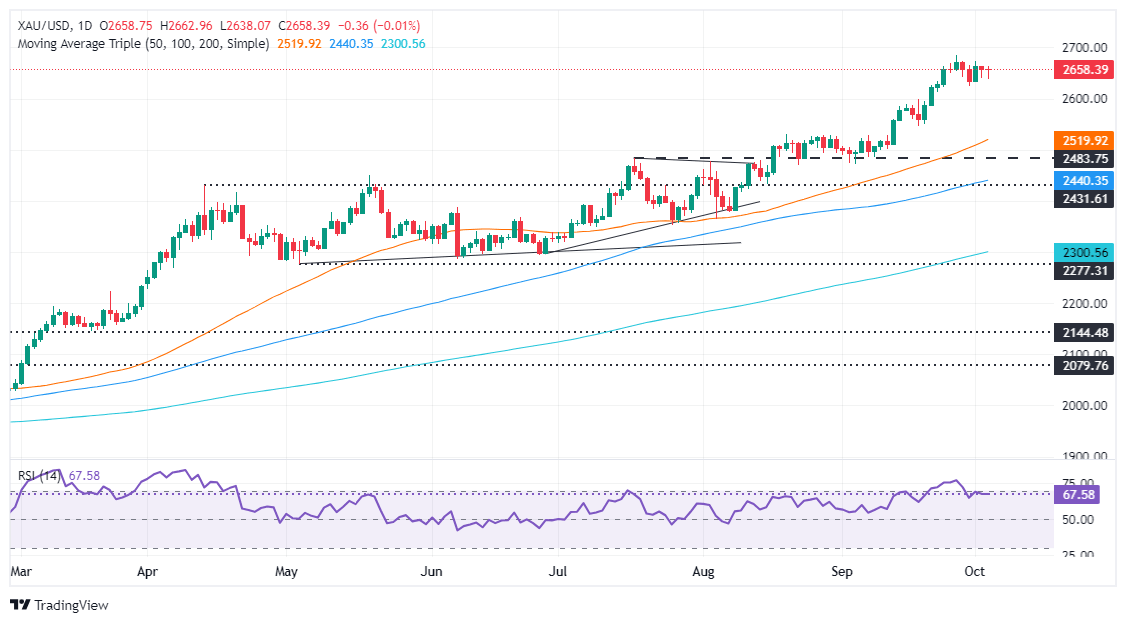 With that said, XAU/USD might trade within familiar levels. If XAU/USD slides underneath $2,650, this would pave the way for further downside, exposing the September 30 daily low of $2,624, followed by the September 18 peak at $2,600. A breach of those levels and the 50-day Simple Moving Average (SMA) would be up next at $2,519.