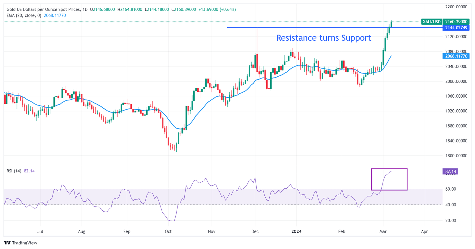 Gold price prints a fresh all-time high at $2,161.60 after breaking above the horizontal resistance plotted from December 4 high near $2,145. The Gold price is trading in unchartered territory and is expected to remain broadly bullish. However, a corrective move in the asset cannot be ruled out as momentum oscillators have reached overbought territory. On the downside, December 4 high near $2,145 and December 28 high at $2,088 will be major support levels.