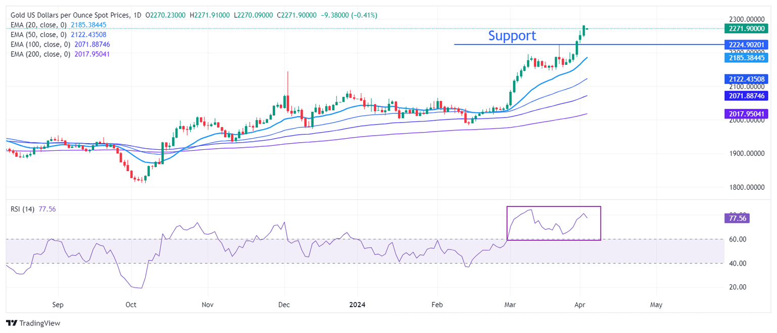 Gold price secures another milestone in Wednesday’s session. The precious metal prints a fresh all-time high near $2,290 after extending above Tuesday’s high of $2,275. However, the yellow metal struggles to continue its six-day winning spell as momentum oscillators have turned extremely overbought. The 14-period Relative Strength Index (RSI) tests 80.00.