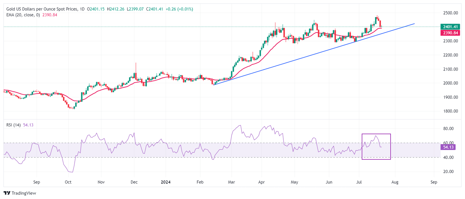 Gold price slides below the round-level support of $2,400 on Monday. The precious metal declines to near the 20-day Exponential Moving Average (EMA), which trades around $2,390, suggesting that the near-term outlook has not weakened yet technically.