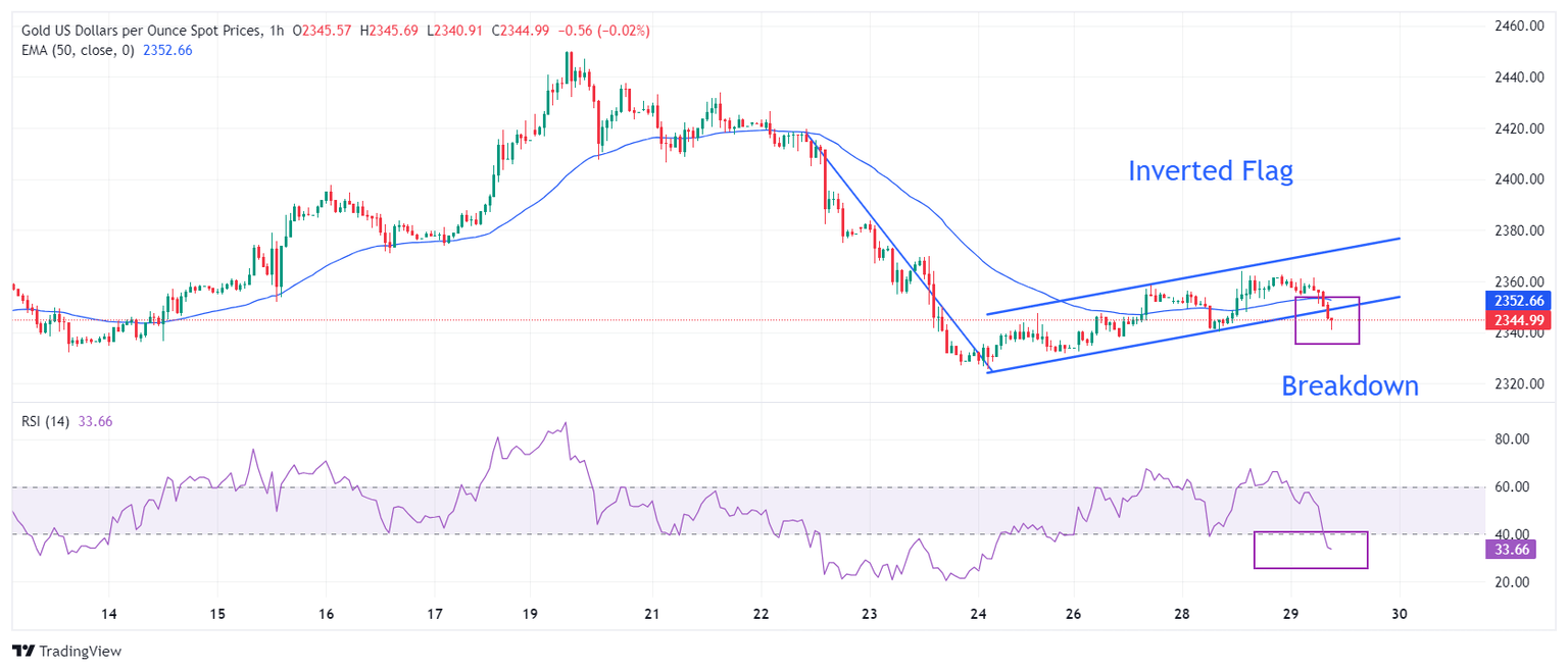 Gold price weakens after the breakdown of an Inverted Flag chart formation on an hourly timeframe. A breakdown of the above-mentioned chart pattern suggests that the downside trend has resumed after the entry of fresh sellers. The near-term outlook is uncertain as the Gold price has slipped below the 50-period Exponential Moving Average (EMA), which trades around $2,350.