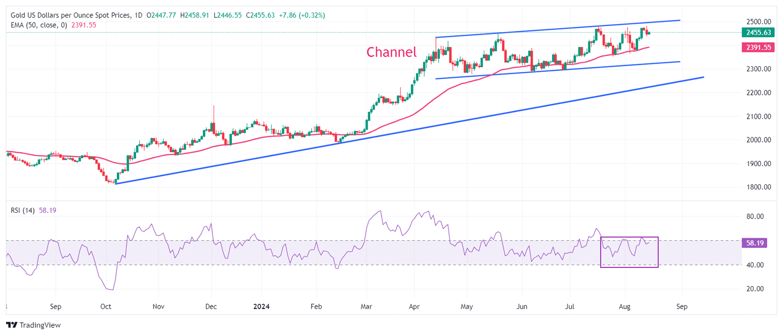 Gold price trades in a channel formation on a daily time frame, which is slightly rising but has been broadly moving sideways for more than three months. The 50-day Exponential Moving Average (EMA) near $2,390 continues to provide support to the Gold price bulls.
