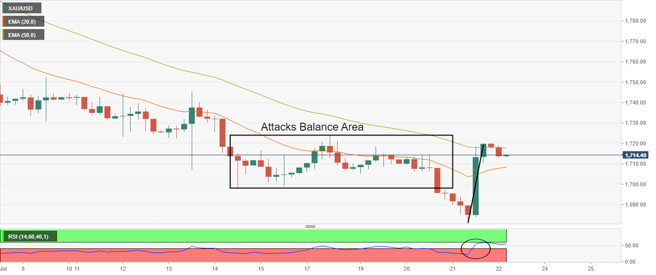 Gold price has attacked the former balance area, which is placed in a wide range of $1,697.69-1,723.27 on the four-hour scale. A responsive buying action has pushed the gold prices above the 20-period Exponential Moving Average (EMA) at $1,708.65. Also, the precious metal has attacked the 50-EMA at $1,718.06, which indicates that the gold bulls are attempting a bullish reversal after a prolonged downside move.