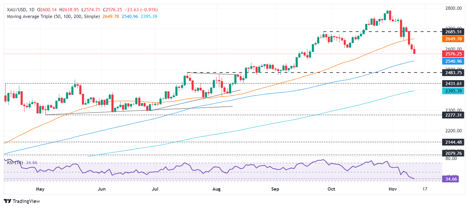 The Gold price has shifted neutral to bearishly biased, once it cleared the October 10 swing low of $2,603. Once bears achieved a daily close below the latter, it opened the door to challenge the 100-day Simple Moving Average (SMA) at $2,540. On further weakness, the next support would be $2,500.