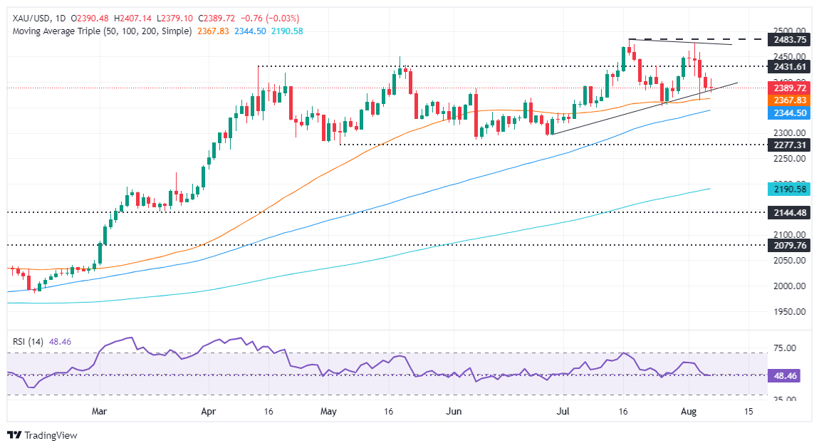 If XAU/USD continues to weaken, the next support would be the 50-day Simple Moving Average (SMA) at $2,367, ahead of the 100-day SMA at $2,344. This would be followed by a support trendline around $2,316. Once cleared, the next support would be $2,277, the May 3 low.