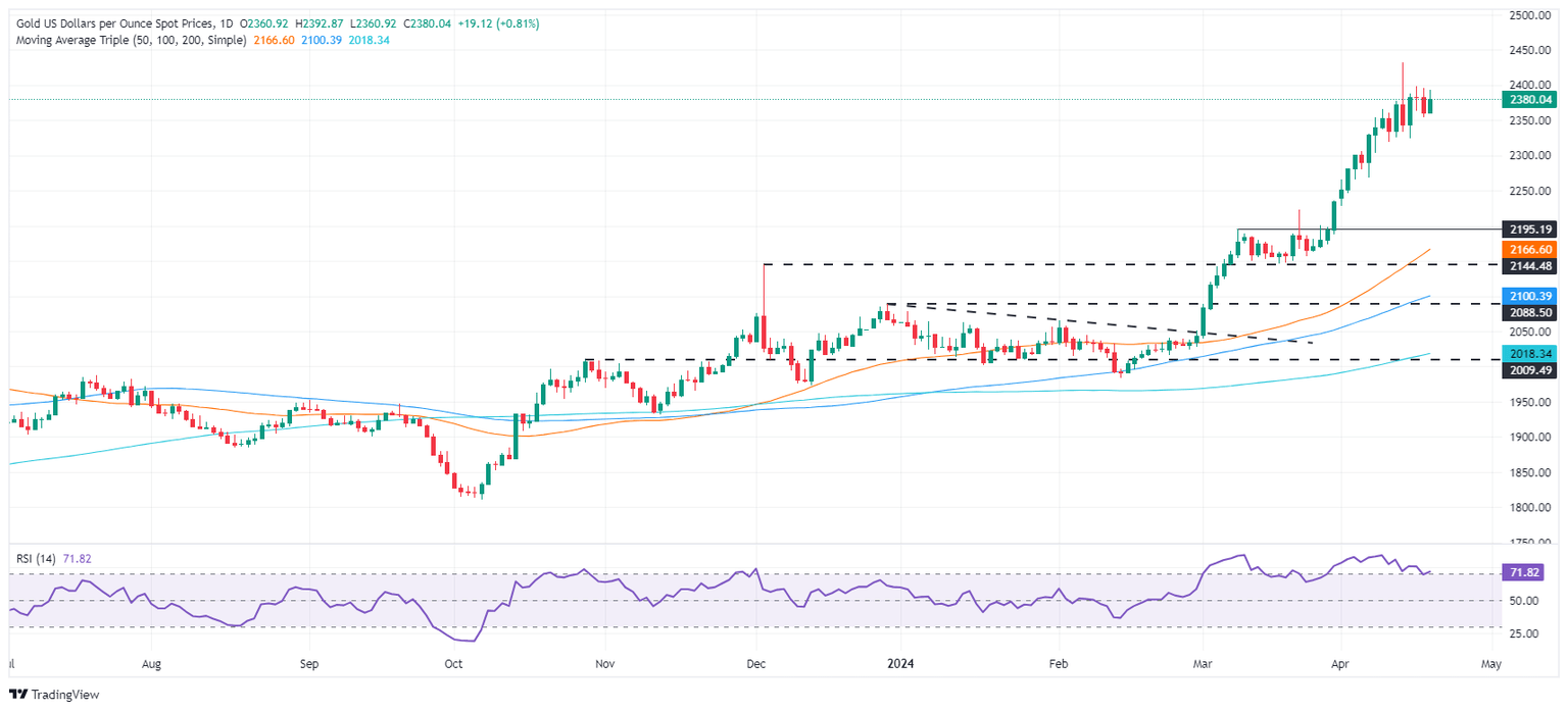 The Gold price remains bullishly biased, and price action of the last couple of trading days appears to form a Bullish Harami chart pattern that reassembles an inside day. That suggests the non-yielding metal could resume its uptrend, even though the Relative Strength Index (RSI) is at overbought levels. That said, buyers need to challenge the $2,400 figure. Once cleared, that could pave the way to test the year-to-date (YTD) high at $2,431.78, ahead of $2,500.