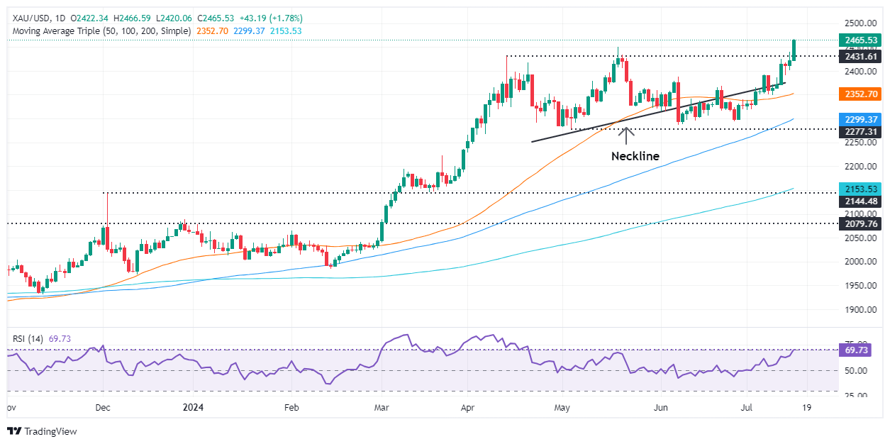 Gold price skyrockets to a new all-time high of $2,469 on Tuesday amid growing bets that the US Federal Reserve (Fed) will begin its easing cycle in September. This, along with increasing chances that former President Donald Trump would win November’s election, underpinned the yellow metal. The XAU/USD trades at $2,467, gains more than 1.70%.