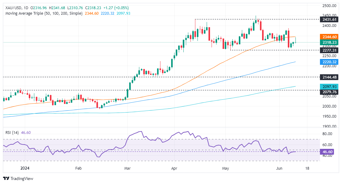 Gold prices climbed on Wednesday following a lower-than-expected inflation report in the United States (US), which increased the odds of a Federal Reserve (Fed) interest rate cut later in the year. Nevertheless, the Federal Reserve's hawkish hold and Fed Chairman Jerome Powell's failure to provide a timetable for rate cuts boosted the Greenback. The XAU/USD trades at $2,318, gains 0.13%.