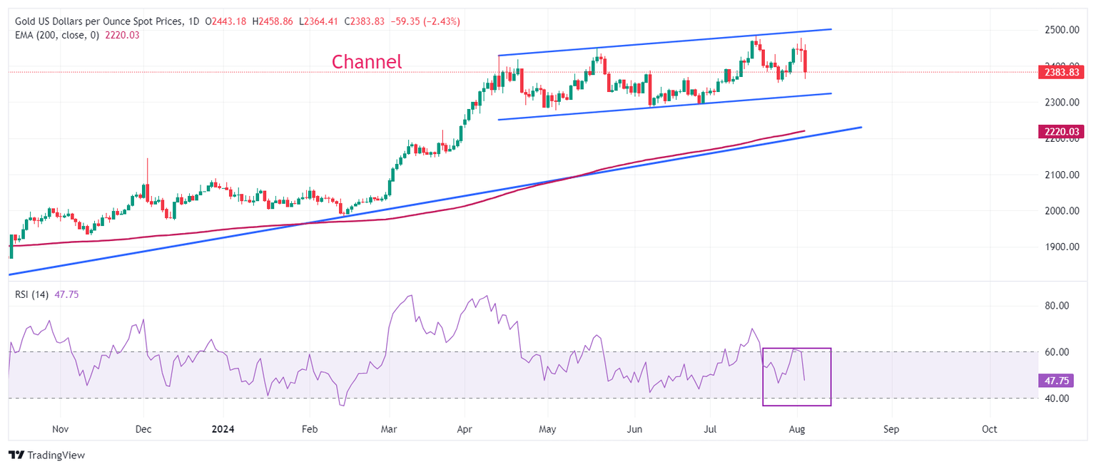 - Gold price drops vertically below $2,400 in Monday’s American session. The precious metal faced selling pressure as profit booking kicked in while attempting to recapture all-time highs above $2,480. The overall outlook of the Gold price remains firm as US bond yields post fresh annual lows.