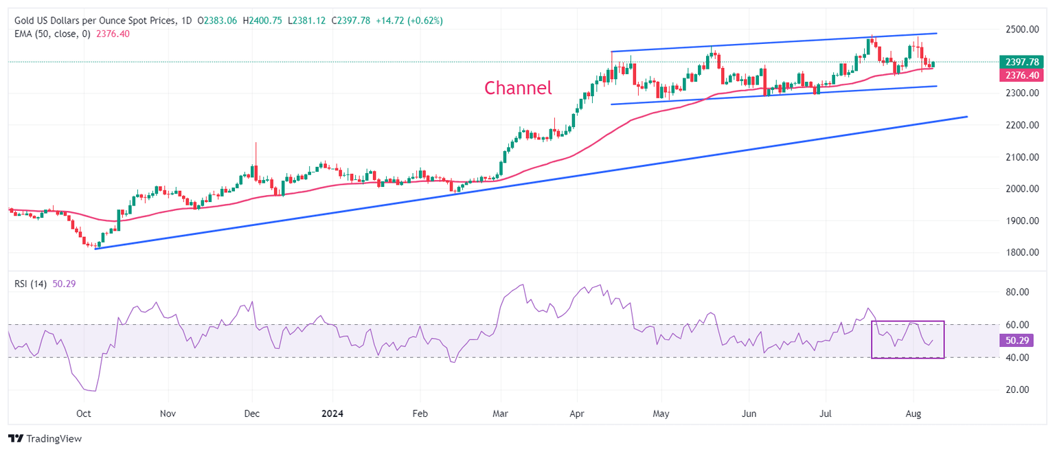 Gold price trades in a channel formation on a daily timeframe, which is slightly rising but broadly exhibited a sideways performance for more than three months. The 50-day Exponential Moving Average (EMA) near $2,370 continues to provide support to the Gold price bulls.