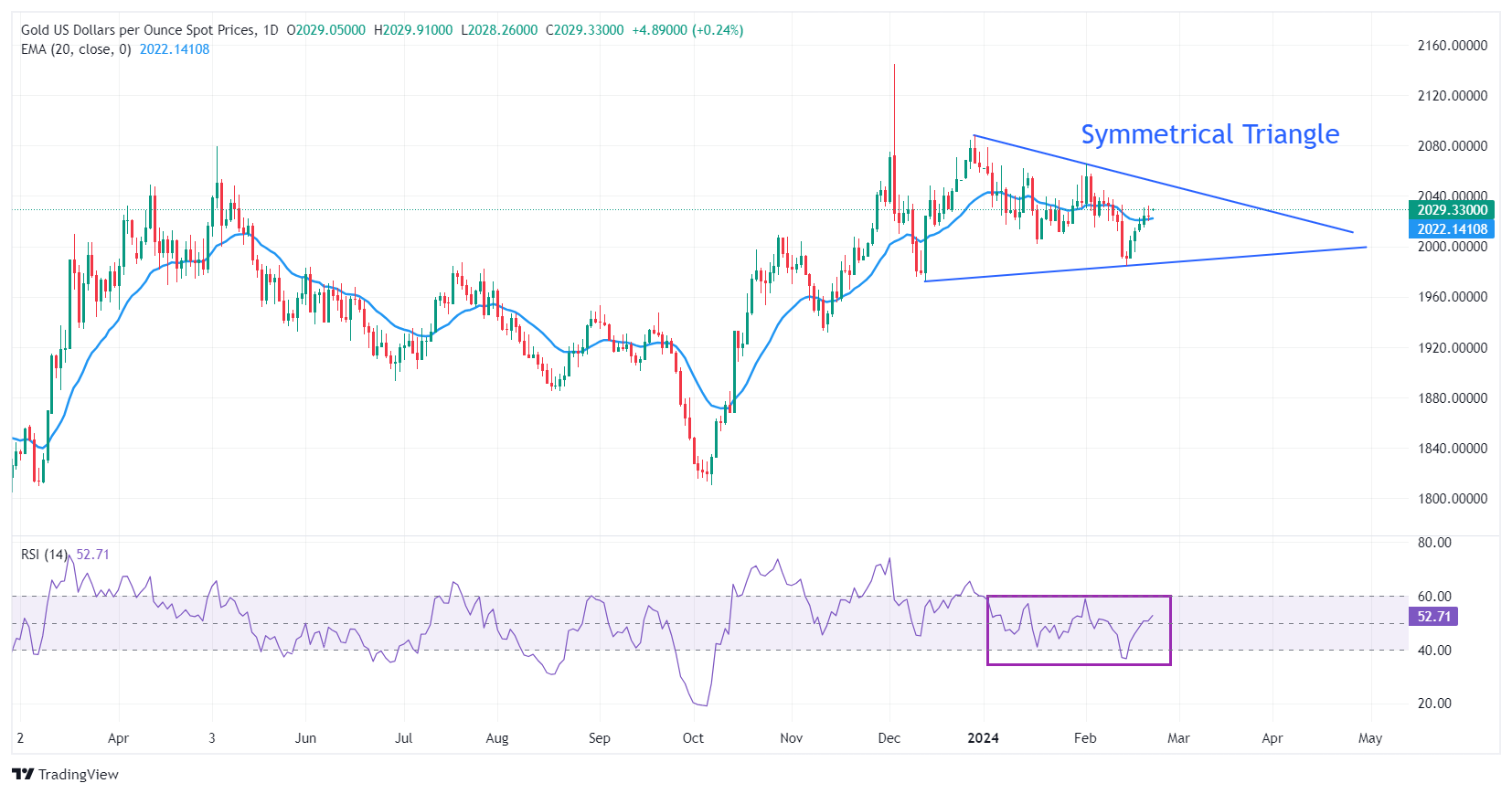 Gold price struggles to hold its winning spell to the sixth day as geopolitical uncertainty deepens. The precious metal has printed a fresh 10-day high near $2,035. The yellow metal is expeditiously approaching the downward-sloping border of the Symmetrical Triangle chart pattern formed on a daily time frame, which is plotted from the December 28 high at $2,088. The upward-sloping border of the aforementioned chart pattern is placed from the December 13 low at $1,973.