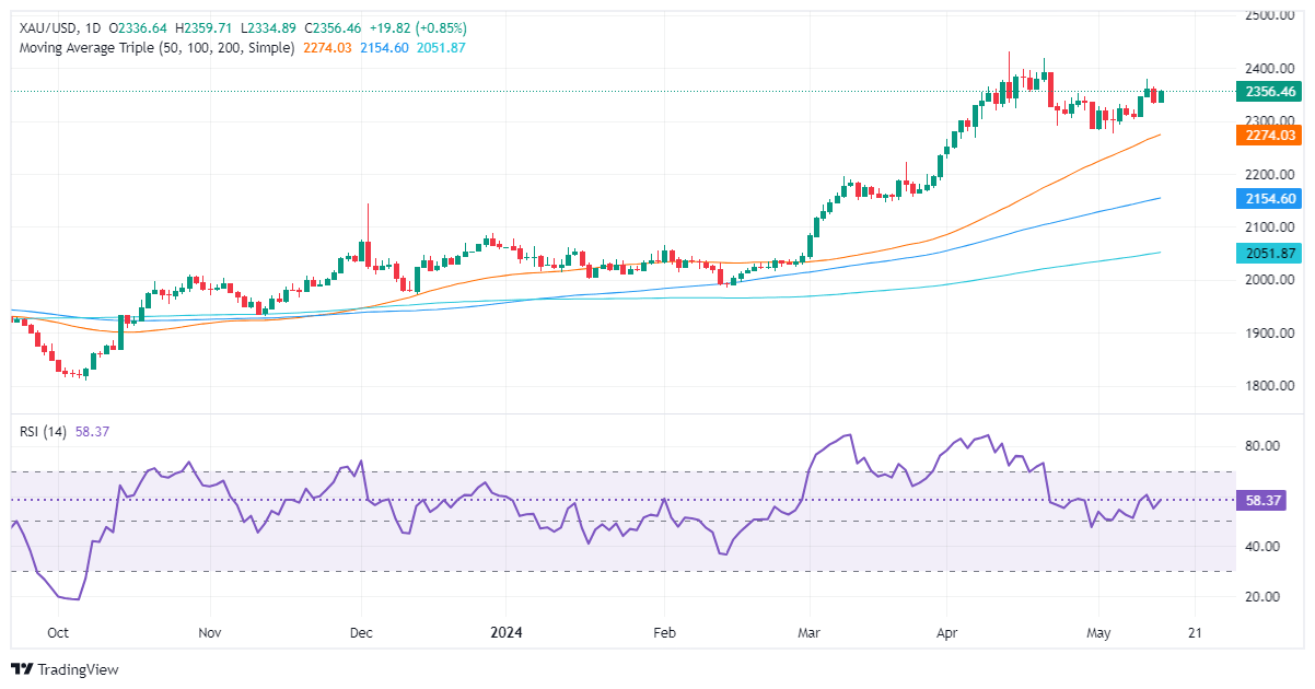 Gold’s uptrend extended after posting losses on Monday, yet it remains below the latest cycle high of $2,378, seen on May 10. This could keep the XAU/USD range bound. According to readings of the Relative Strength Index (RSI), momentum is in favor of the bulls.
