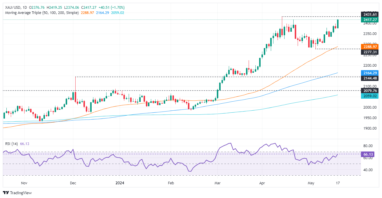 Gold's price skyrocketed during the North American session ahead of the weekend as XAU/USD traded above $2,400, posting gains of more than 1.5% amid higher US Treasury bond yields. The non-yielding metal extended its advancement and threatened to crack the all-time high of $2,431.